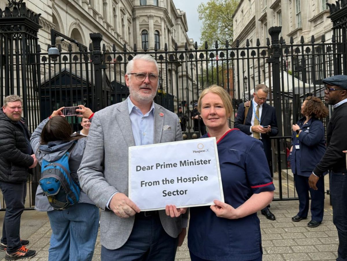 Michael Crowther, Chief Executive, and Sonia Tyndall, Matron in Specialist Palliative Care, join Hospice UK's Fairer Funding campaign in Downing Street.