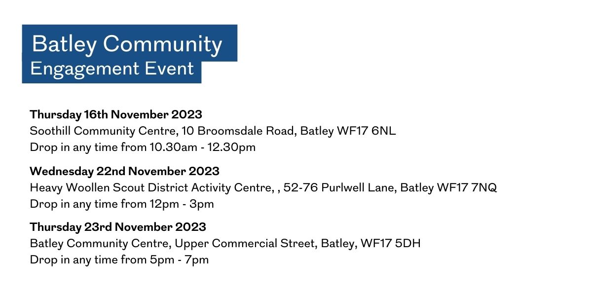 Come along and drop in to our engagement events, Batley this November! Find out how The Kirkwood Support Life, help us to understand your needs and how we can work together to build a healthier, more supportive and inclusive community.