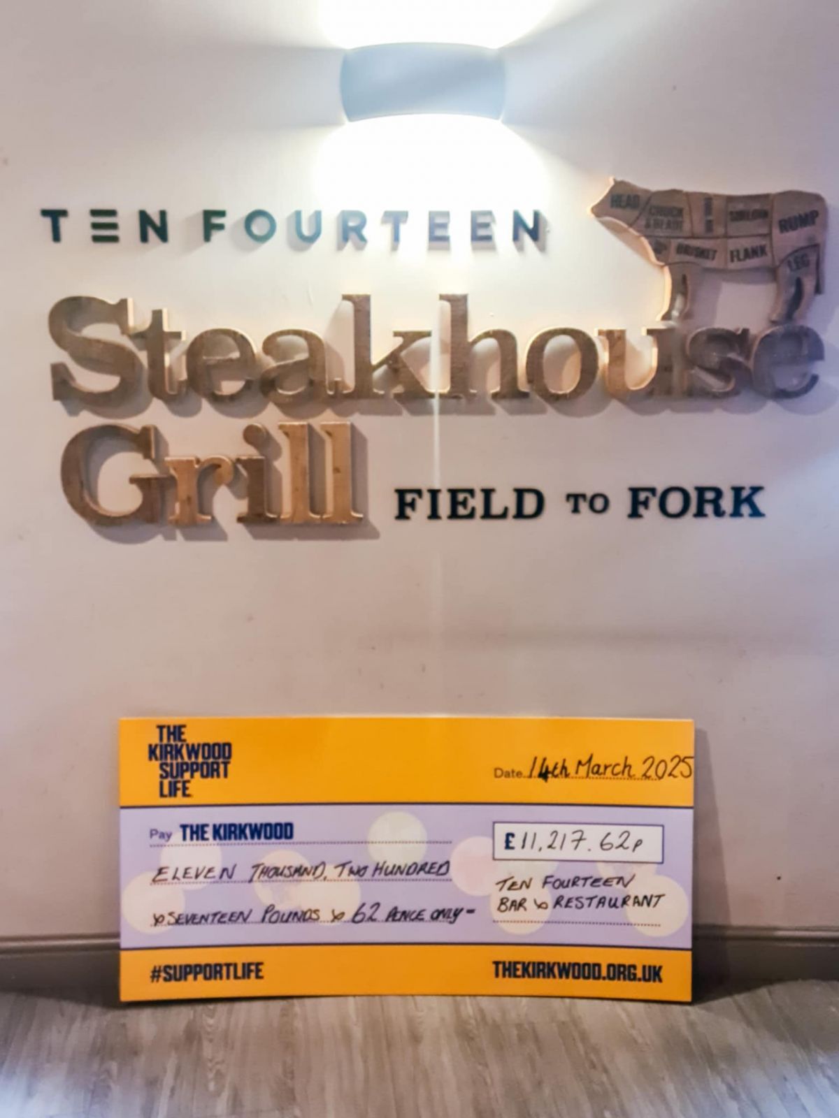 Thanks to the unwavering support of the team at 1014, and in particular the tireless efforts of Jayne Coxhead, the venue has raised in excess of £11,000 to support The Kirkwood’s work in the local community. This incredible total has been achieved through a vibrant calendar of events including festive favourites such as ‘Tea with Santa’, fashion shows, a ‘Harvest at Home’ celebration, and regular quiz nights, all hosted at the popular Holmfirth venue.