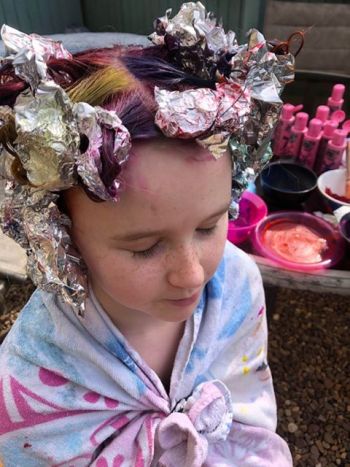 Esme waiting patiently for her rainbow hair to set.