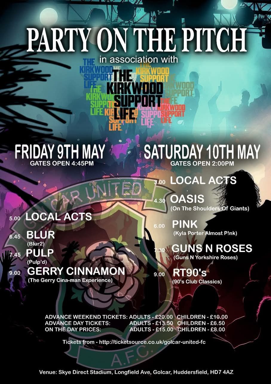 Golcar United’s much-anticipated Party on the Pitch is set to return for its fourth year on Friday 9th May and Saturday 10th May at Skye Direct Stadium, Longfield Avenue, Golcar, Huddersfield. This two-day festival promises an incredible line-up of some of the UK’s top tribute acts while raising vital funds to support both the football club and The Kirkwood.