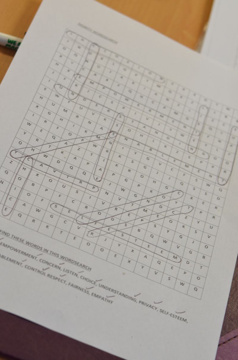 Digni-Tea Day also gave Kirkwood patients the opportunity to try out some of the relaxing therapies and services on offer, and to unwind with some treats and themed games. A wordsearch, completed by both patients and volunteers, encompassed key themes, such as empowerment, independence and privacy.