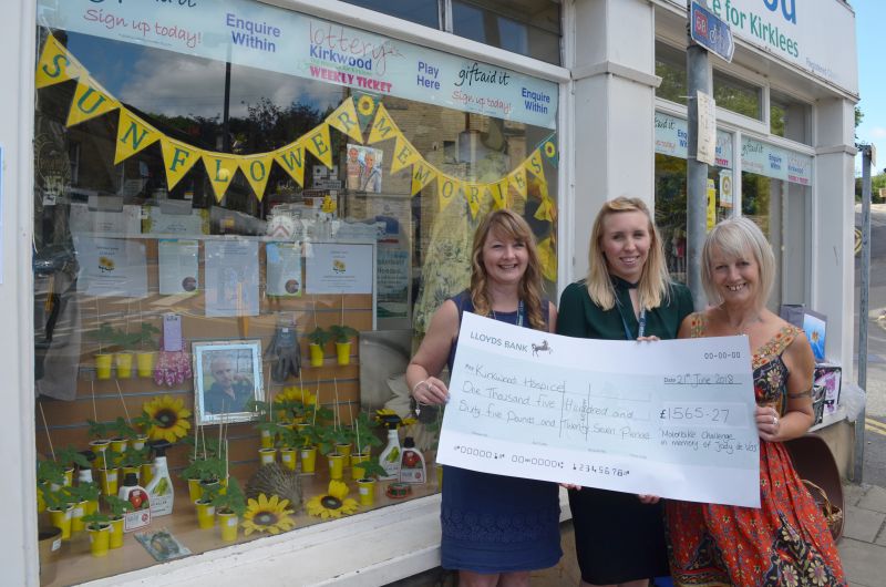 Jude Sellmeyer (right) presents a cheque to Shop Manager, Michaela Statham, and Community Fundraiser, Nicola Barber, outside the Shop Window in Holmfirth