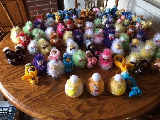 Hand-knitted Easter Chicks hand-made and filled with a Creme Egg to sell in aid of Kirkwood.