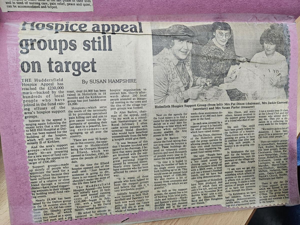 So when she read in the Huddersfield Examiner about a meeting to explore establishing a hospice in the area, she felt immediately drawn to it: “When I saw the piece in the Examiner about a meeting in Huddersfield, me and my daughter went along. They asked for volunteers to start support groups, and I just thought, yes, this is something we need. So as a little team we started the support group in Holmfirth. We had some lovely fun times and raised thousands of pounds for the hospice. Alongside volunteering in the hospice shop, we spent many happy hours working with the help of a great team, making it a vital part of the fundraising effort. People were really interested in the hospice, that’s where it all began for us.”